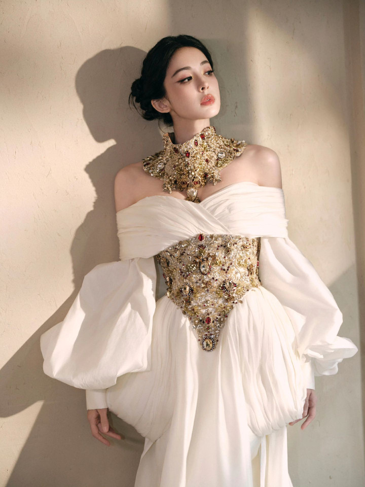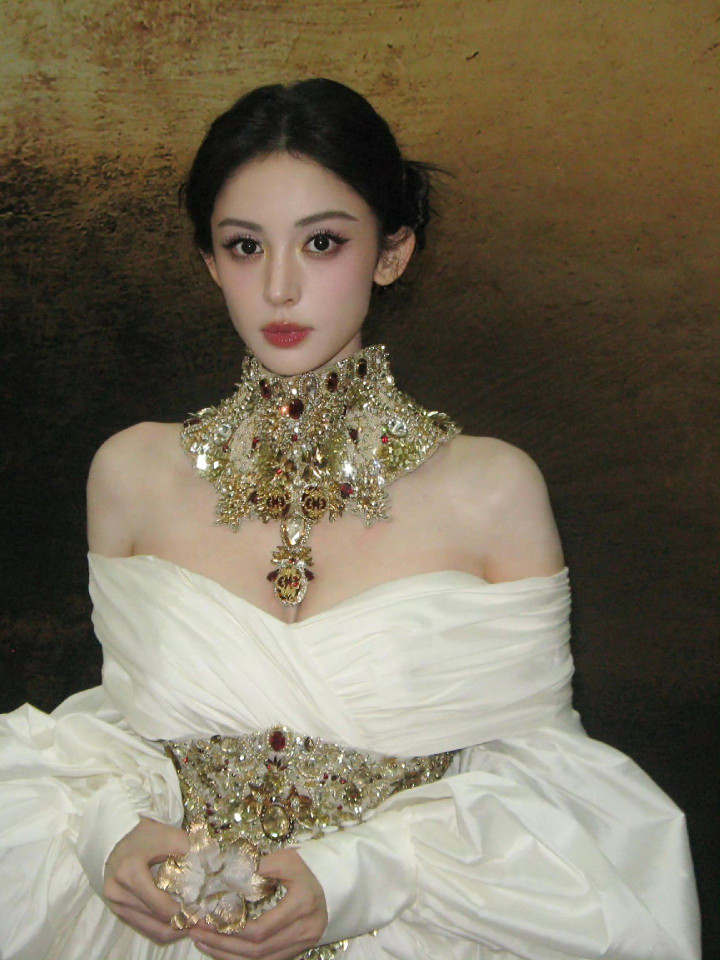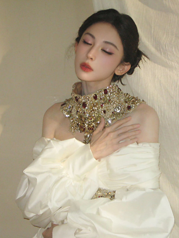 都市丽人古力娜扎, 梦笑开娇靥, 眠鬟压落花。簟文生玉腕, 香汗浸红纱